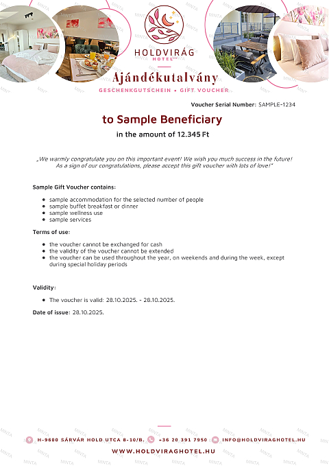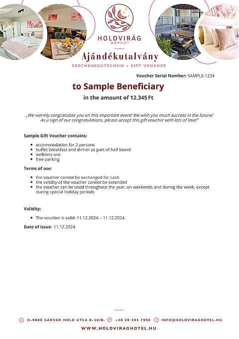 - Gift voucher redeemable for services at the Holdvirág Hotel *** in Sárvár.